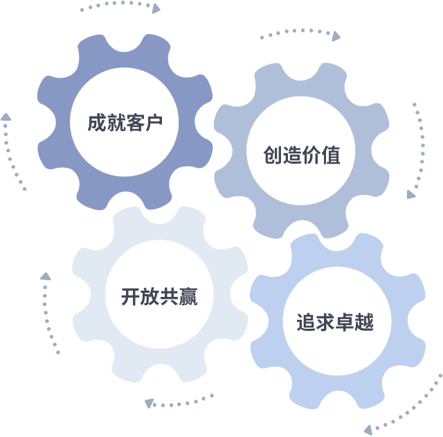 成就客户是一切决策的出发点,,,,创造价值是衡量所有工作的标准,,追求卓越是我们做事做人的态度,,,开放共赢是我们的格局也是最终的结果。。。。价值观的齿轮环环相扣,,推动着组织里的每个人不断向前。。。。